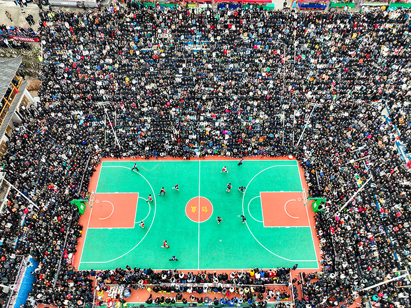 這是2023年3月27日在黔東南州臺江縣臺盤村拍攝的貴州省首屆“美麗鄉(xiāng)村”籃球聯(lián)賽總決賽比賽現(xiàn)場(無人機(jī)照片)。新華社記者 歐東衢 攝