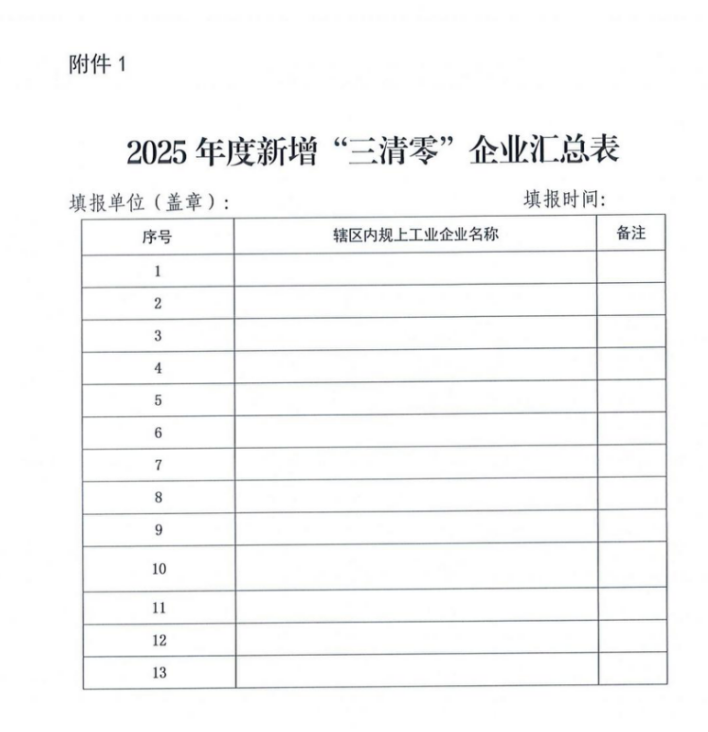 1.建立工作臺賬,填寫上報(bào)2025年度新增“三清零”企業(yè)匯總表(見附件1)。